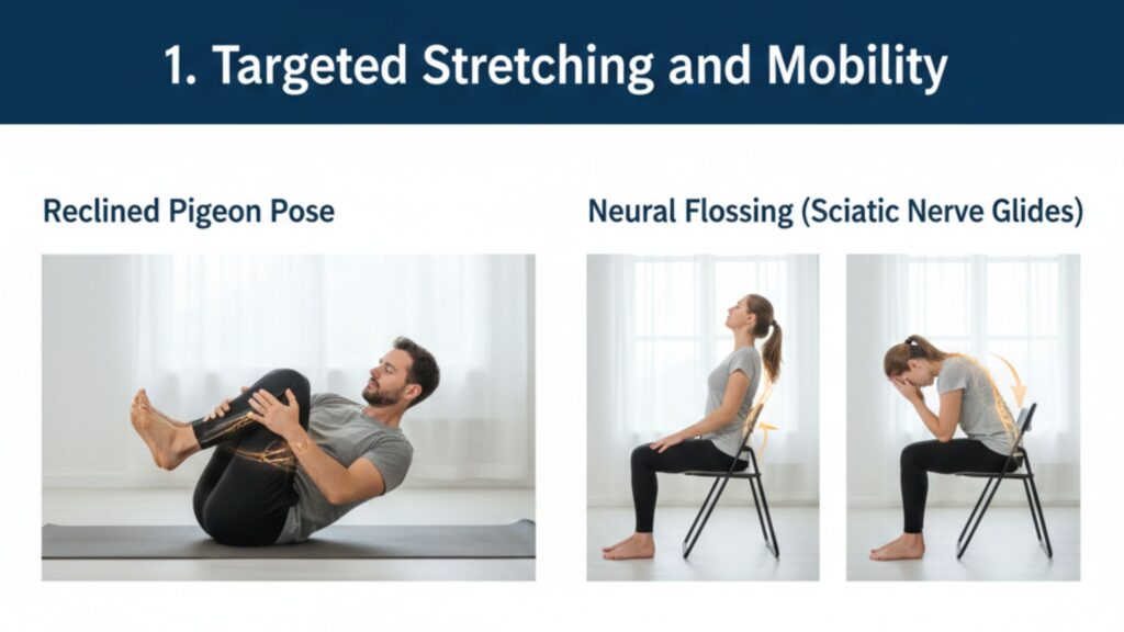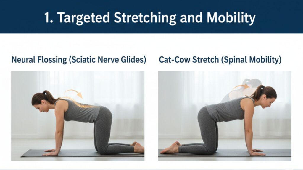 - न्यूरल फ्लॉसिंग (Neural Flossing): इसे आप नस की “सफाई” जैसा समझ सकते हैं। बैठते समय, धीरे-धीरे अपने घुटने को सीधा करें और छत की ओर देखें, फिर घुटने को मोड़ते हुए अपनी ठुड्डी को छाती से लगाएं।